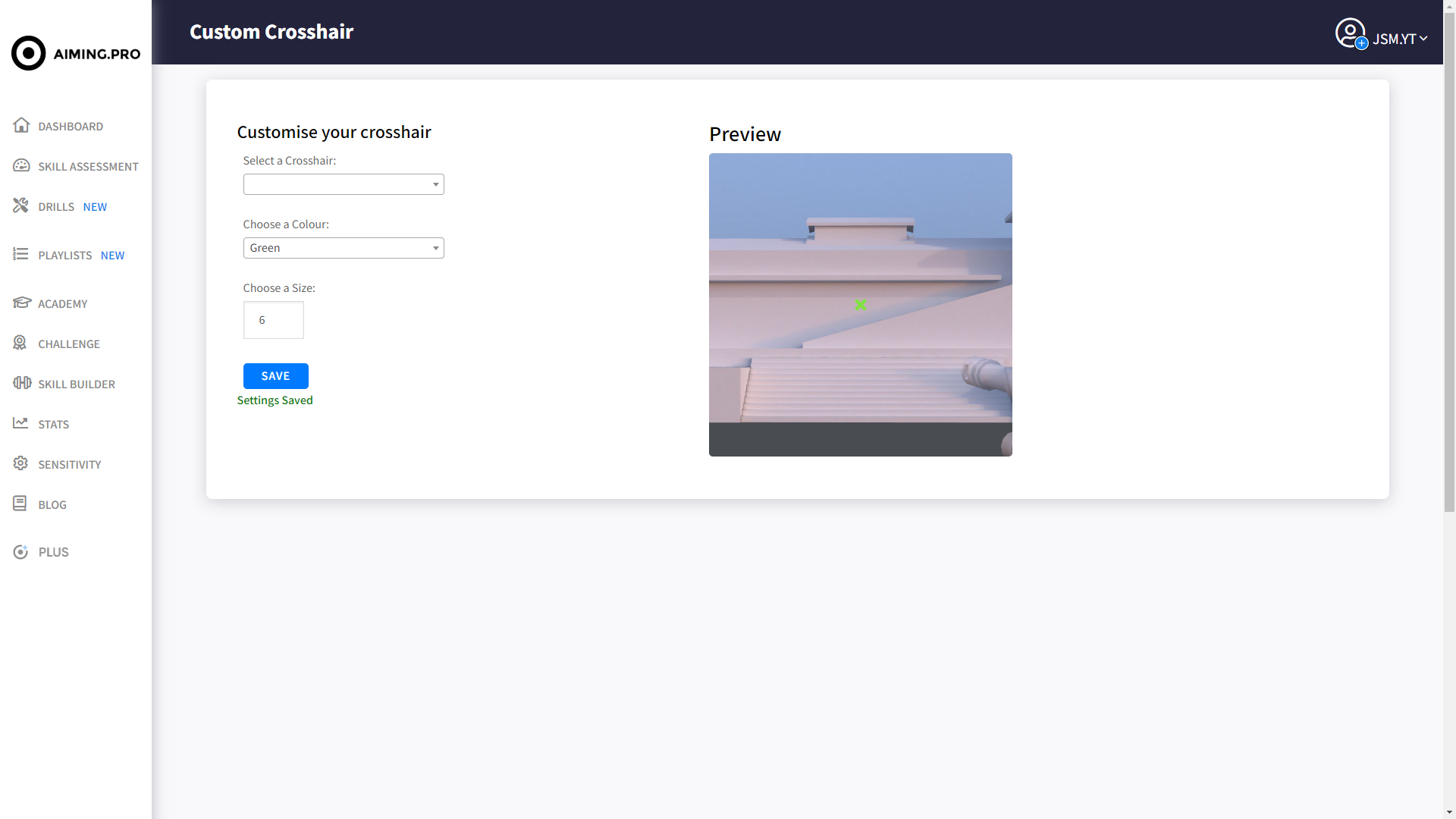 Customising your crosshairs is just as easy. Heading to your profile at the top, you can select the crosshair customisation option from the dropdown menu. You will be met with the customisation page. You will see a preview of the current crosshairs with the option to choose a crosshairs, their colour and their scale. Choose wisely!