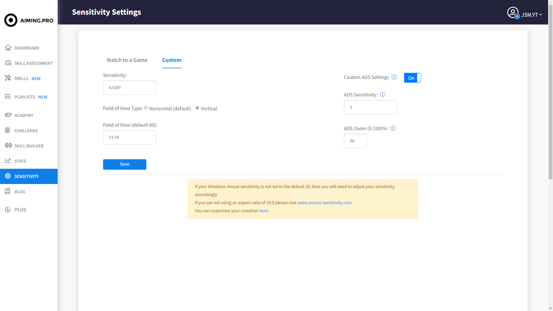 To take this to the next level, you can take your custom Aiming.Pro sensitivity and choose a custom Field Of View (FOV) option. This allows you to tailor your aim training experience exactly how you want it.