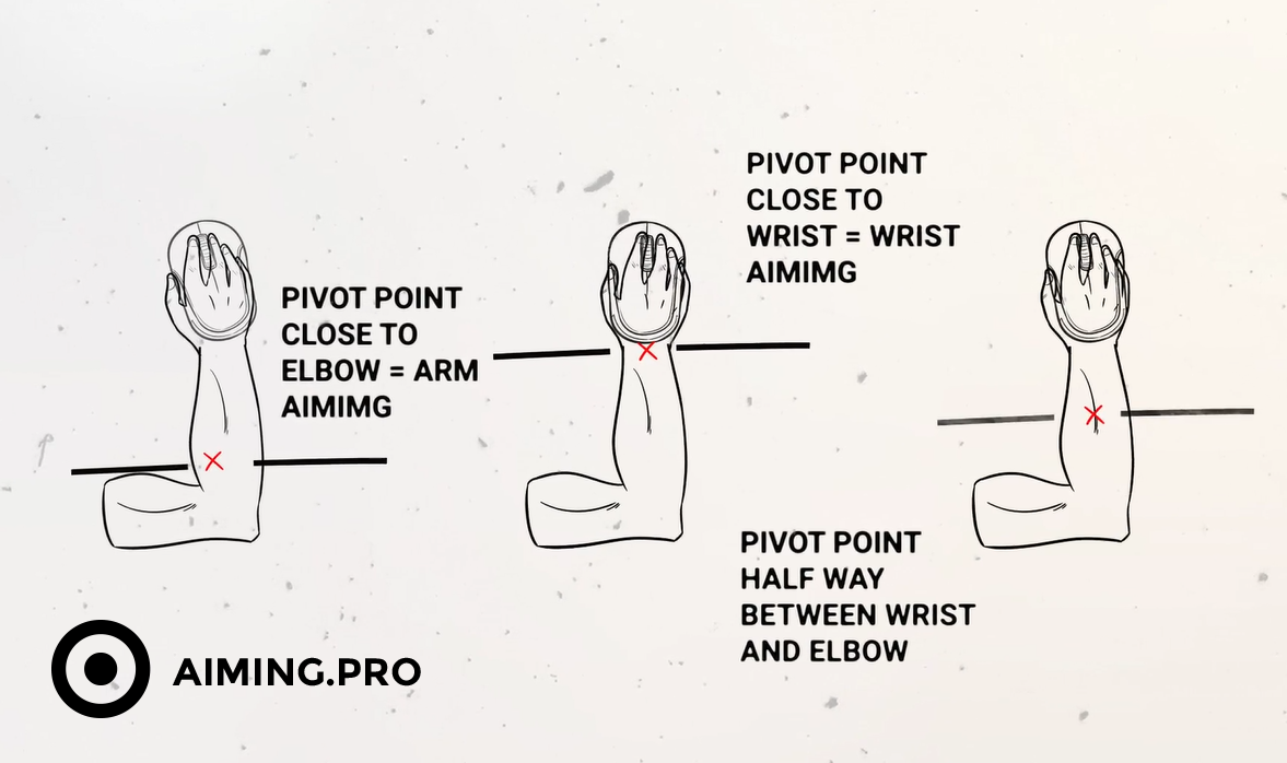 You can choose a pivot point anywhere between your wrist and your elbow. A pivot point close to your wrist will lead to a wrist-aiming technique and require a high sensitivity.