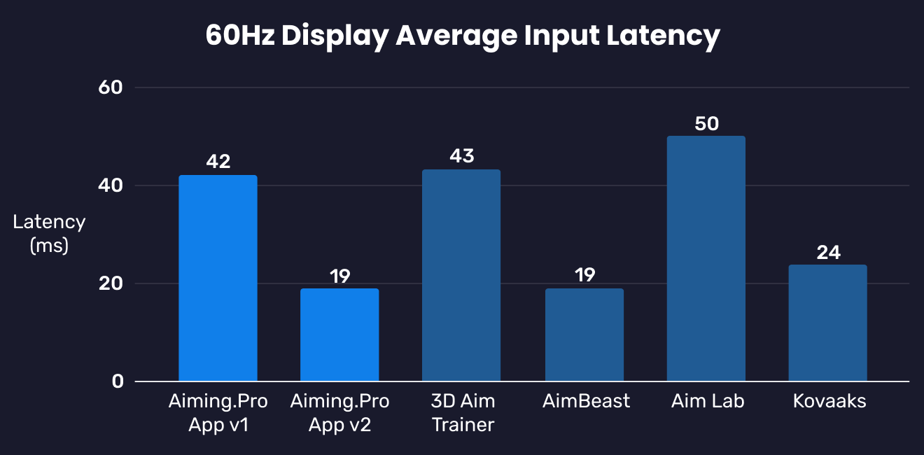 As you can see, before the most recent update, the Aiming.Pro desktop app was lagging fractions of a second behind some of the other aim trainers but with this new update, we’ve achieved 2.2x better latency on a 60hz monitor and 1.5x faster on a 165Hz monitor.